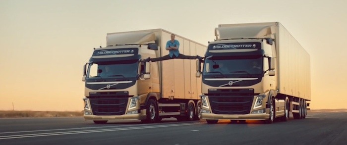 [La photo ci-dessus est issue de cette pub Volvo qui cumule des millions de vues sur Youtube. Jean-Claude Van Damme, les pieds sur deux camions roulants, y effectue son célèbre grand écart pour promouvoir la précision et la stabilité directionnelle des véhicules Volvo. La vidéo a été tournée sans trucage : Jean-Claude sait toujours faire le grand-écart, même à 53 ans, avec un visage hyper lifté. Il a cependant été accroché à des lignes de sécurité qui ne sont pas visibles dans le film, au cas où il se ramasserait (voir cet article de Voici.fr 😉]